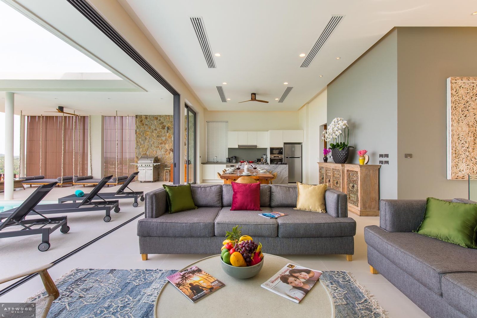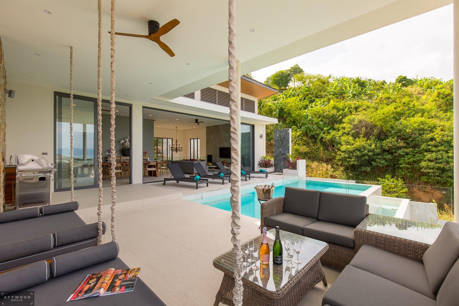 Then a stylish outdoor sofa under the covered Sala with BBQ in a open space sanctuary with overlooking the beautiful sea view with Ko Pha Ngan island beyond.