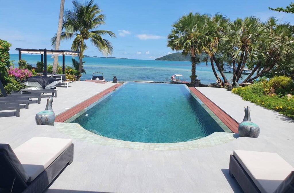 The outdoor covered dining area faces the pool area and the seafront splendor .